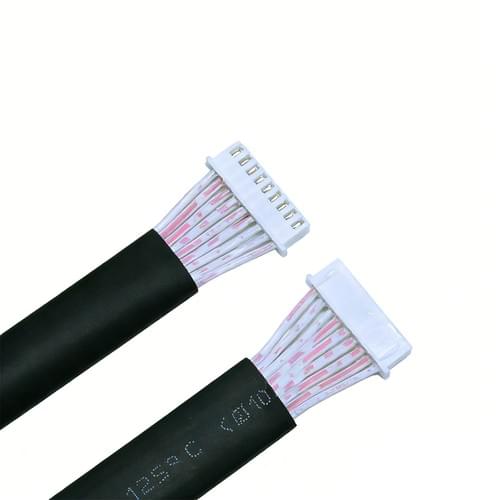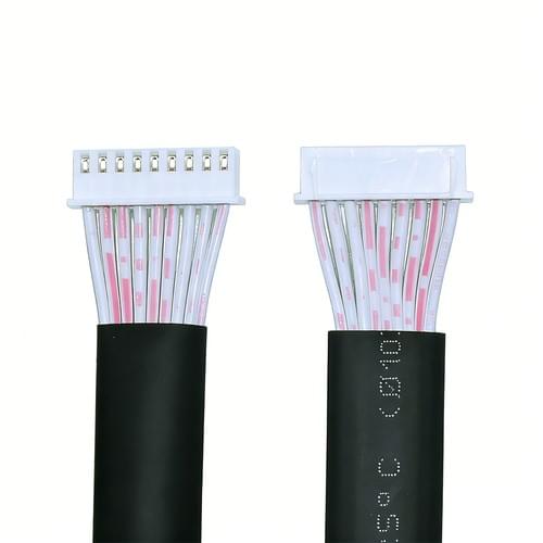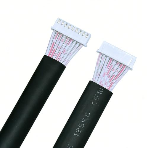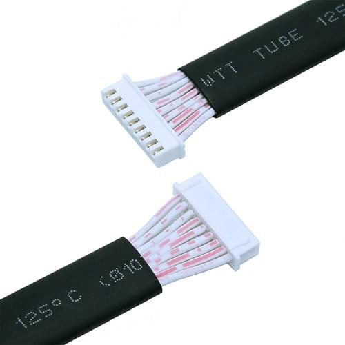 Space-saving flat ribbon cable harness with dual JST-XH connectors. Ideal for PCB/display connections in electronics. Features heat shrink strain relief for durability. Custom pin counts and lengths available. #FlatRibbonCable #WireHarness #ElectronicsManufacturing